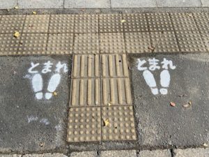年に1度、足跡のペンキを塗り直しております。子ども達が横断歩道の手前でしっかり止まるようにする大事な目印となります。