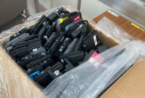 各クラスより回収しインクカートリッジの集計や管理、発送等を行っております。皆様が一生懸命集めてくれたインクカートリッジを学校・子供たちのために大事に使わせていただいております。